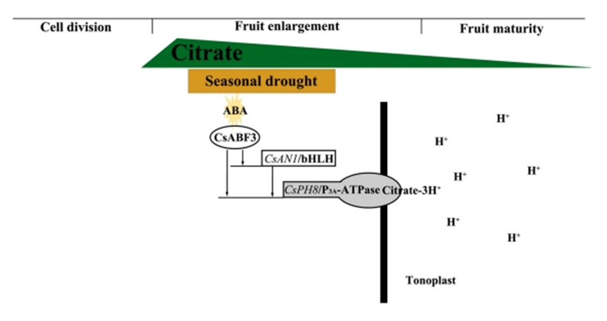 本研究总结出干旱-ABA-CsABF3-CsAN1/CsPH8的调控通路,即夏秋季节性干旱导致ABA信号通路中的CsABF3上调表达,进而激活CsAN1和CsPH8,CsAN1同时也激活CsPH8,CsPH8的上调导致大量柠檬酸转运至液泡,最终导致果实酸化。该研究为阐明柑橘果实干旱致酸机制进而进行针对性地调控果实品质提供重要理论基础。