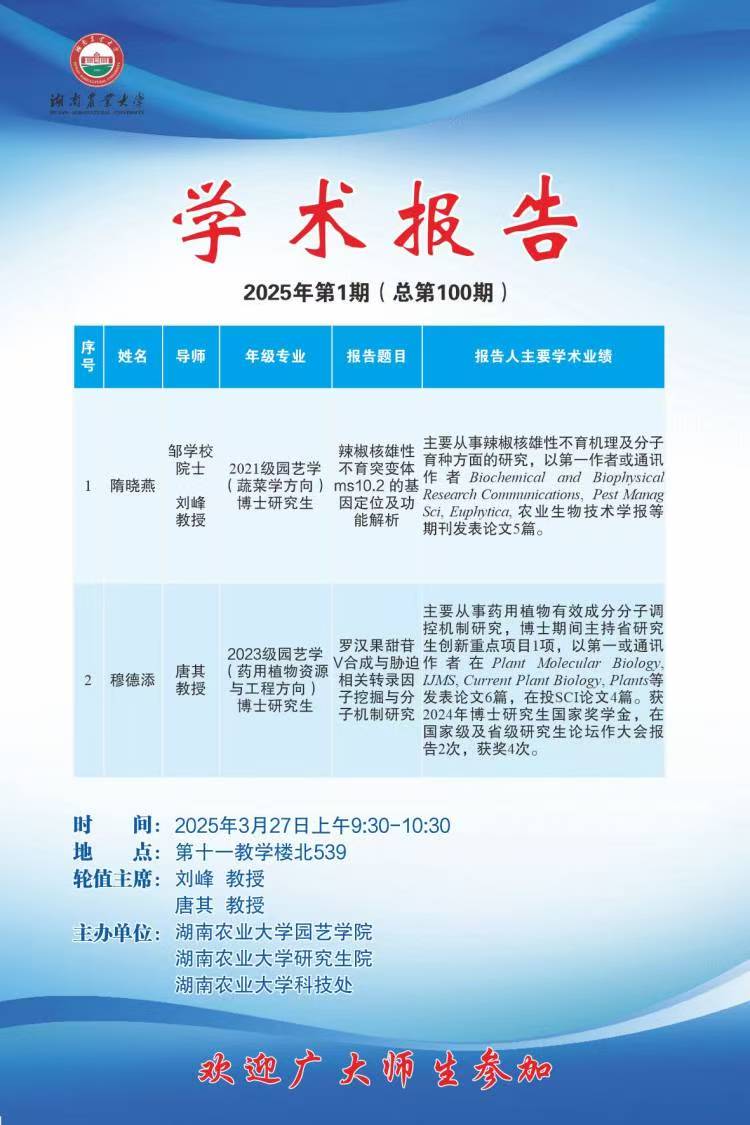 园艺讲坛第100期-博学讲坛:辣椒核雄性不育突变体ms10.2的基因定位及功能解析;罗汉果甜苷Ⅴ合成与胁迫相关转录因子挖掘与分子机制研究