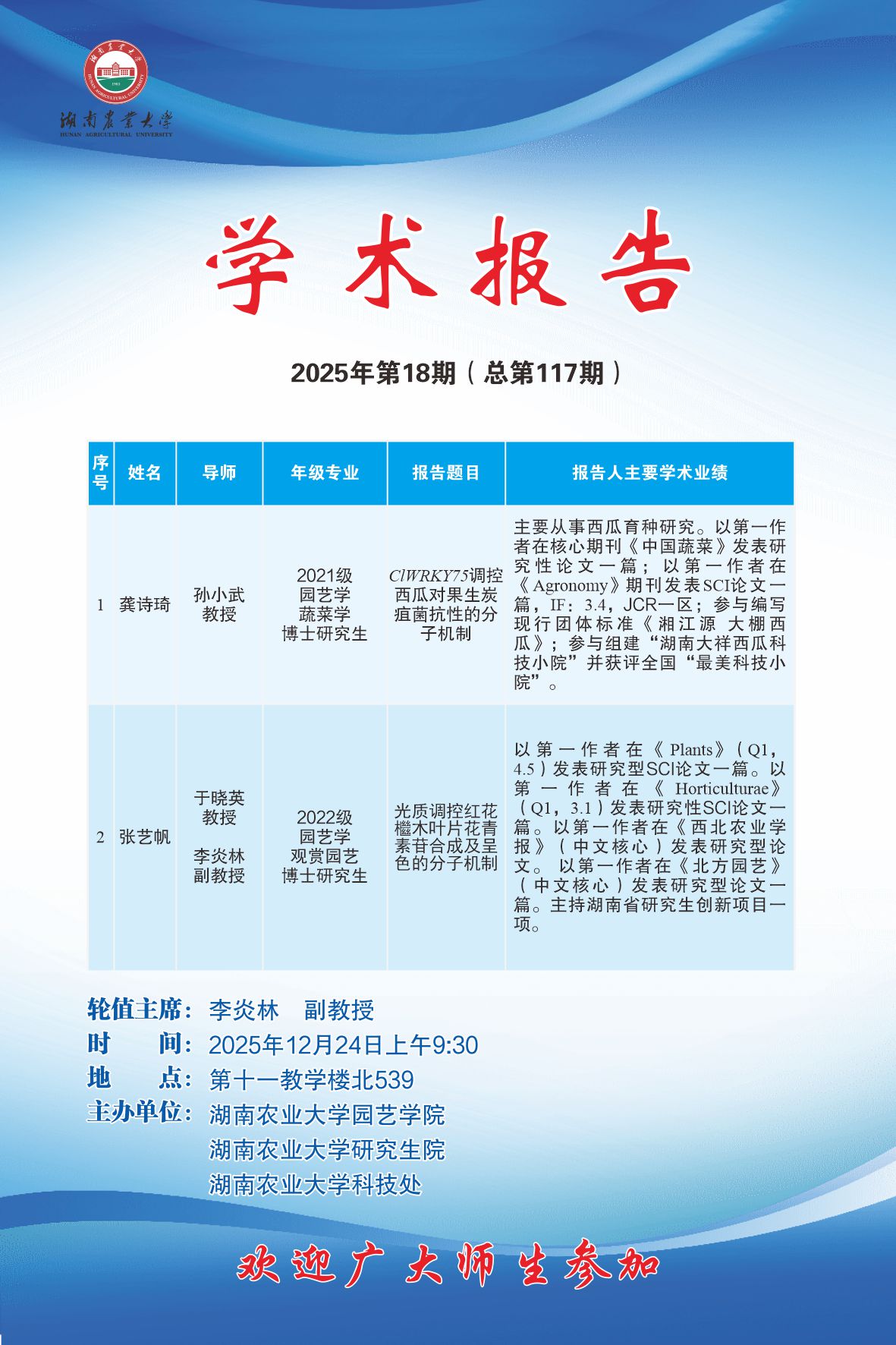 园艺讲坛第117期-博学讲坛:ClWRKY75调控西瓜对果生炭疽菌抗性的分子机制 光质调控红花檵木叶片花青素苷合成及呈色的分子机制