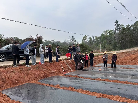 春寒料峭,难阻服务热忱。培训结束后,服务团队冒雨深入种植基地开展实地指导。在泥泞的田垄间,师生与村民共同开展种茎处理、播种覆土等实操,雨水浸透衣衫却热情不减。宋勇教授在劳作间隙感慨道:“我们既要教会技术,更要传递‘变荒地为金山’的发展信心。这些00后研究生用沾满泥土的双手证明,农业科研的价值就在祖国的大地上。”