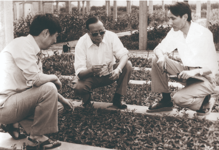 80年代茶学施兆鹏教授查看茶苗生长情况(左一)
